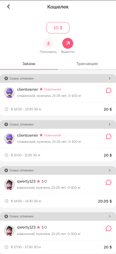 On the main screen of the Wallet, you can find the current account balance, buttons for depositing and withdrawing funds, as well as the history of all sessions and related information.